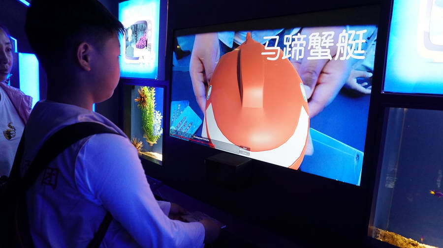 在海底负一层,小记者们来到“海底小纵队”主题生物展区。展区中间富有现代高科技感的浮空台,模拟章鱼堡上的操控台,轮番显示《海底小纵队》里8个卡通动物的三维立体图像,孩子们犹如置身于海底飞船当中。